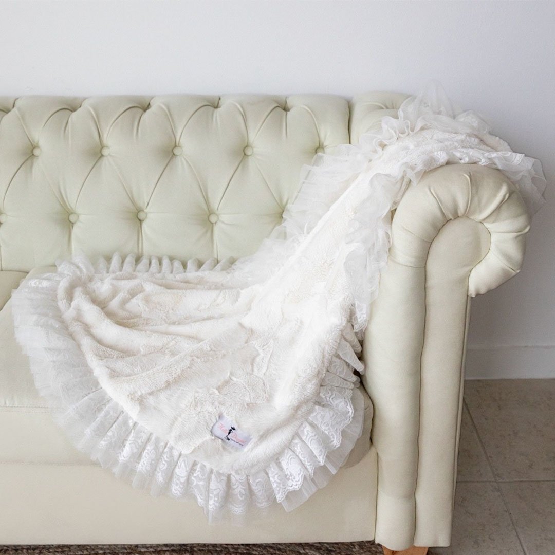 This beautiful soft blanket by Hello Doggie is made of high quality soft fabric and features a double layer of 2 tiered romantic lace. It’s so soft your pup won’t leave it. The lace gives the blanket an elegant touch, perfect for home decor. This blanket is easy to care for, spot clean or hand wash and air dry. Add an additional 2" for the satin ruffle for large blanket and add additional 1" for the small. Small Blanket - *17" x 14"     |     For dogs up to 4 Lbs   Large Blanket - *34” x 29"     |    For dogs up to 20 Lbs Throw Blanket - *58” x 58"     |    For dogs up to 100 Lbs *Blanket is handmade and sizes may vary slightly. Made in USA.