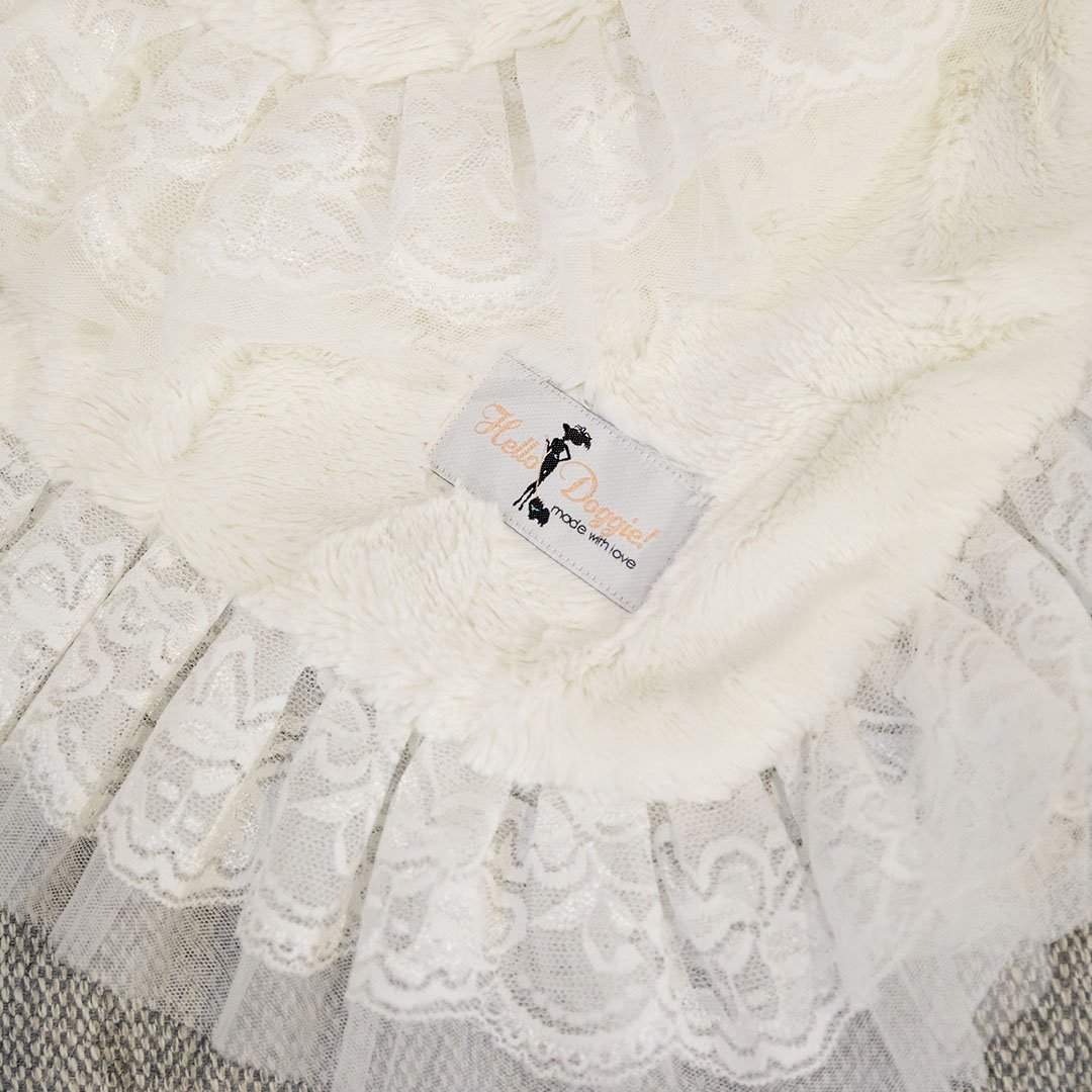 This beautiful soft blanket by Hello Doggie is made of high quality soft fabric and features a double layer of 2 tiered romantic lace. It’s so soft your pup won’t leave it. The lace gives the blanket an elegant touch, perfect for home decor. This blanket is easy to care for, spot clean or hand wash and air dry. Add an additional 2" for the satin ruffle for large blanket and add additional 1" for the small. Small Blanket - *17" x 14"     |     For dogs up to 4 Lbs   Large Blanket - *34” x 29"     |    For dogs up to 20 Lbs Throw Blanket - *58” x 58"     |    For dogs up to 100 Lbs *Blanket is handmade and sizes may vary slightly. Made in USA.