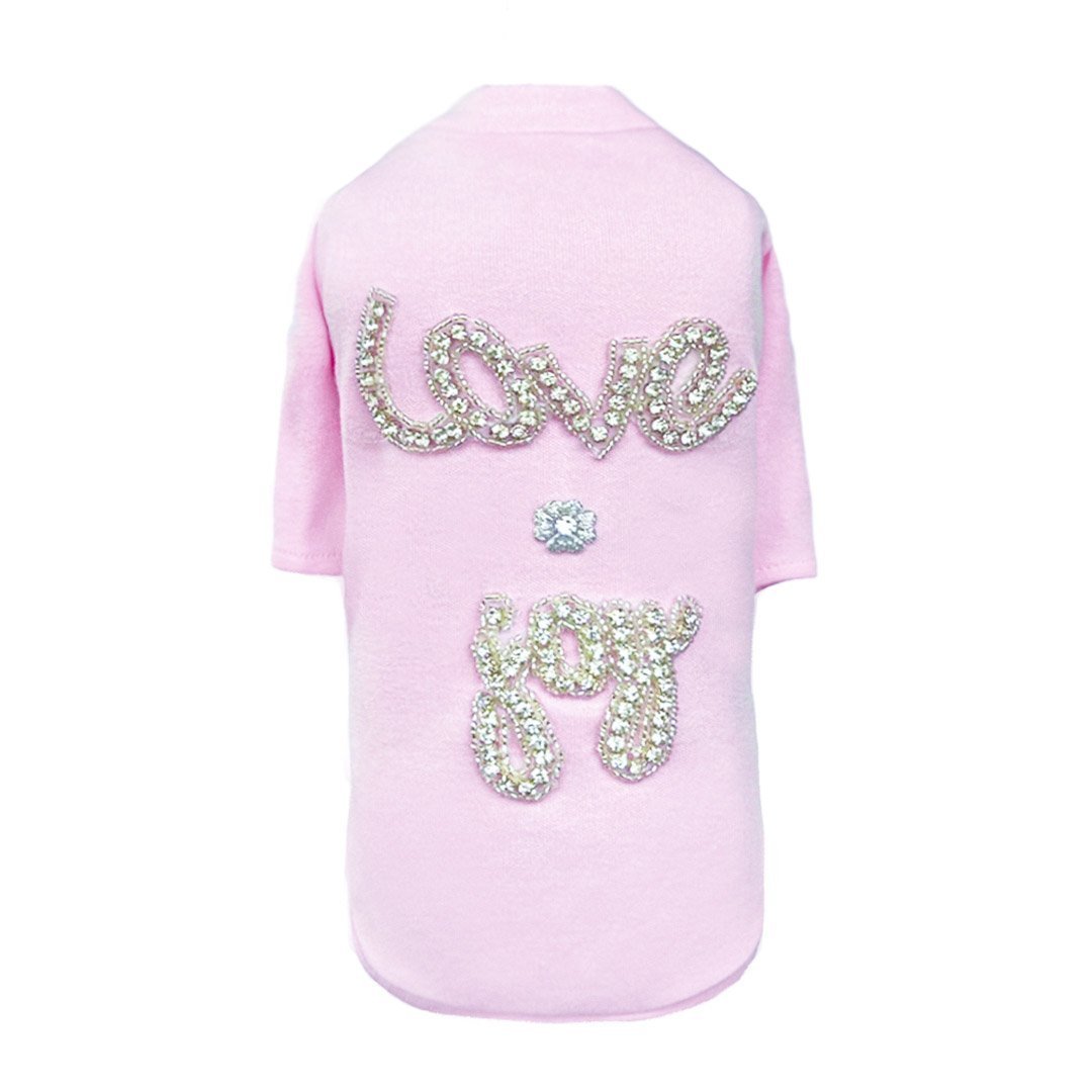 Treat your four-legged companion to the Love and Joy Dog Tee by Hello Doggie, and let them strut their stuff with comfort and style. Made from 100%  cotton Jersey knit textile, this tee provides a soft and breathable , perfect for all-day wear. The love and joy appliqués on the tee add a touch of charm and elegance to your baby’s outfit, featuring a stunning silver flower design embellished with a sparkling Swarovski Crystal, creating a luxurious look. For a brand new look  every time, turn inside out spot clean or wash on delicate, no bleach or softener and air dry. Sizes   |  XS - LG  MSRP  |  $36.00  *Tees are handmade and sizes may vary slightly. Made in USA.